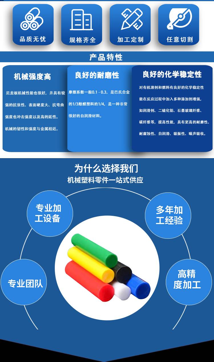 UHMW-PE、含油尼龍、MC尼龍、POM、PP、PE1000,PTFE,PEI,